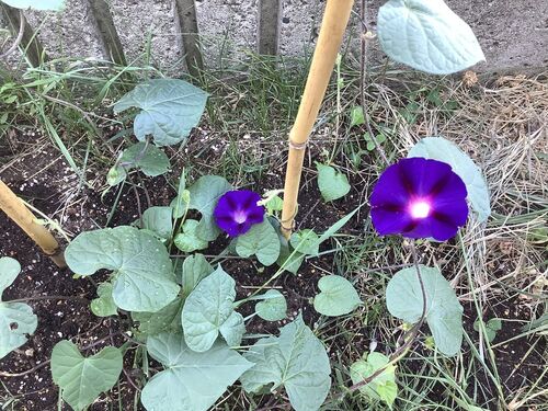 玄関先に朝顔が咲いた。 塀の内側に何かの蔓が伸びて草に絡みついていていた。ある朝、ポッと青い朝顔が開いて驚いた。食べ終わった豆苗の根を土に漉き込んでいたので豆の蔓かな?と思っていたのだ。ーーーいったい朝顔はどこから来たの? まっ、いっか。こ…